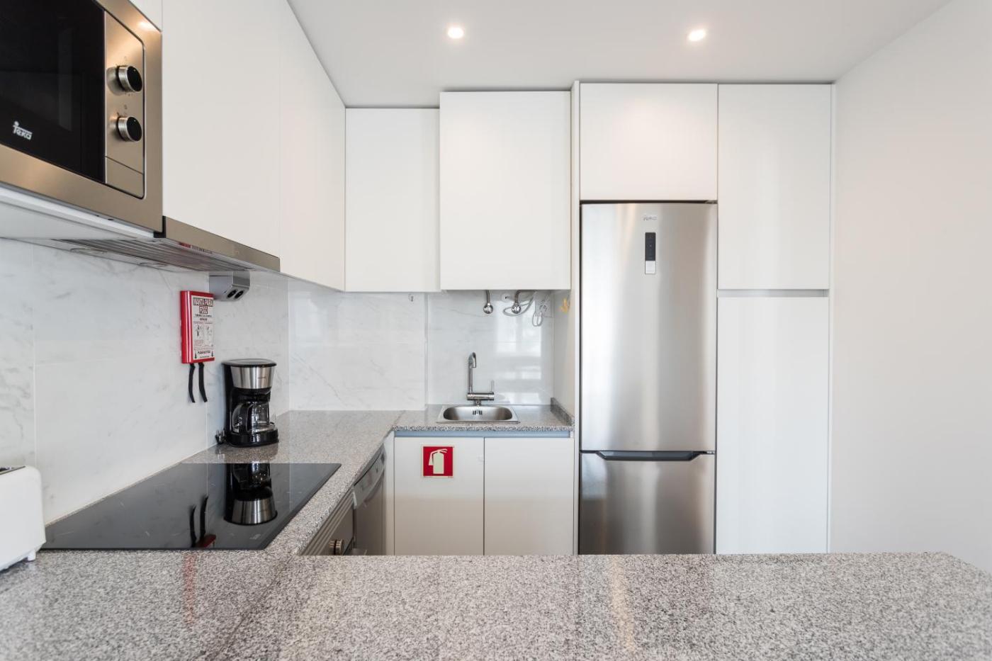 Apartamento Estúdio. Guests can make meals in the kitchen that features a stovetop, a refrigerator, a dishwasher and kitchenware. This apartment is air-conditioned and has a seating area with a TV, a washing machine, an electric kettle and a sofa. The unit has 1 bed.