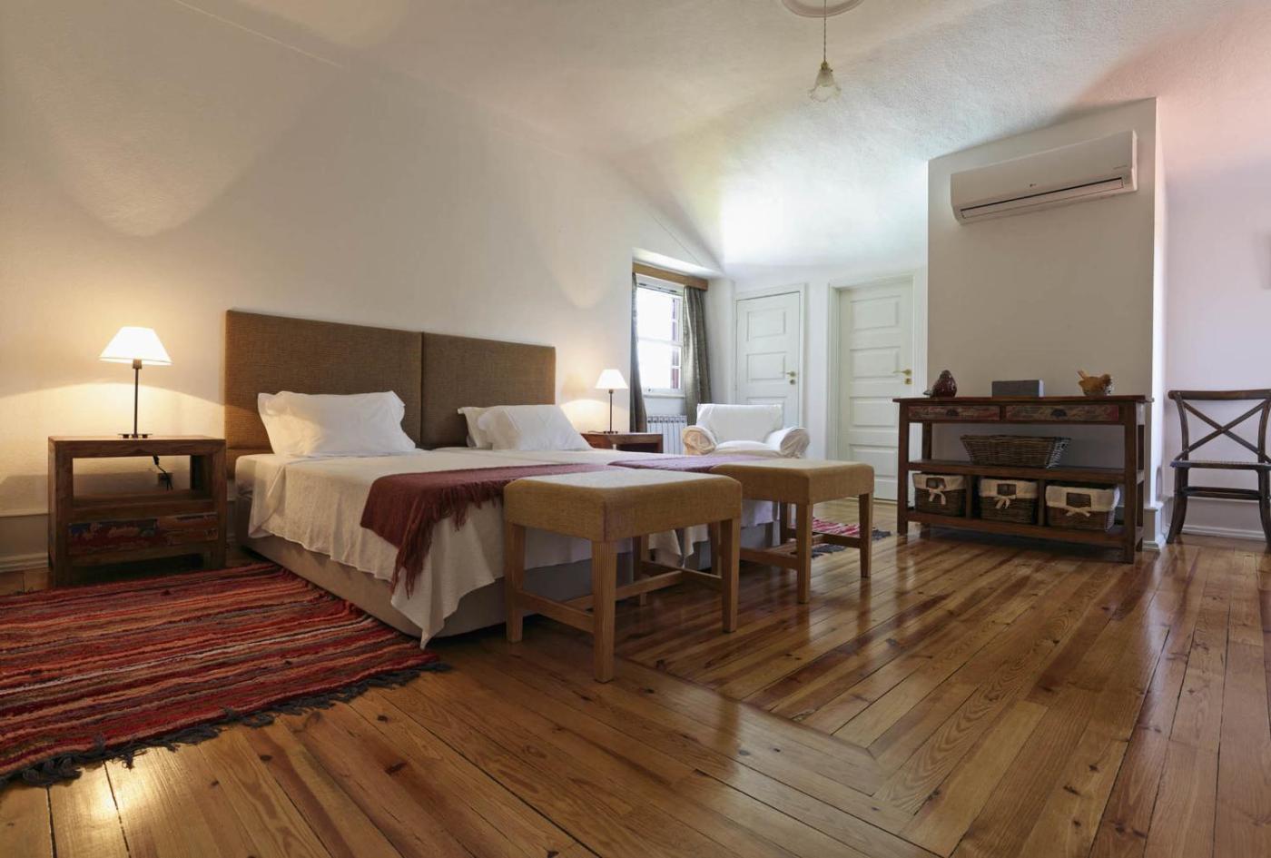 Quarto Duplo. This double room features wooden floors and a private bathroom. ;
